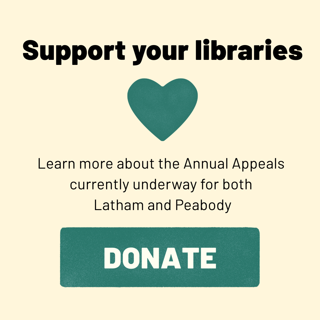 - Grant opportunities – Latham and Peabody receive federal grants for our summer reading program and interlibrary loan courier service. Both of our libraries were also watching for upcoming capital grants to help with much-needed building repairs, the second round of which have not yet been announced.
